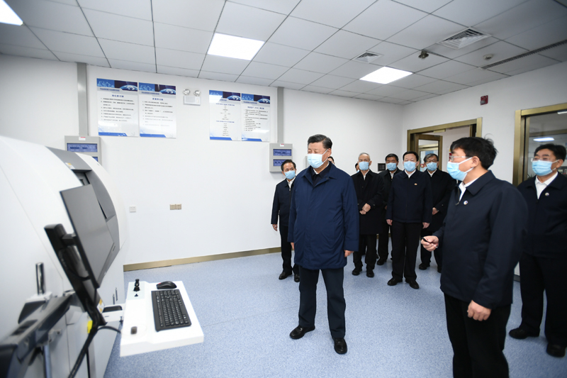10月22日下午,中共中央總書記、國家主席、中央軍委主席習近平在山東省濟南市主持召開深入推動黃河流域生態保護和高質量發展座談會并發表重要講話。這是座談會前,習近平21日下午在東營市勝利油田勘探開發研究院二氧化碳氣驅實驗室考察自主創新情況。新華社記者 李學仁 攝