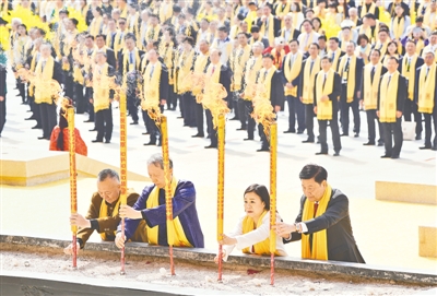 恭讀拜文。“粵稽遐古,天地洪荒,具茨綿綿,我祖是降……”王光謙登上拜祖臺(tái),以全球華人之名,肅手恭頌。