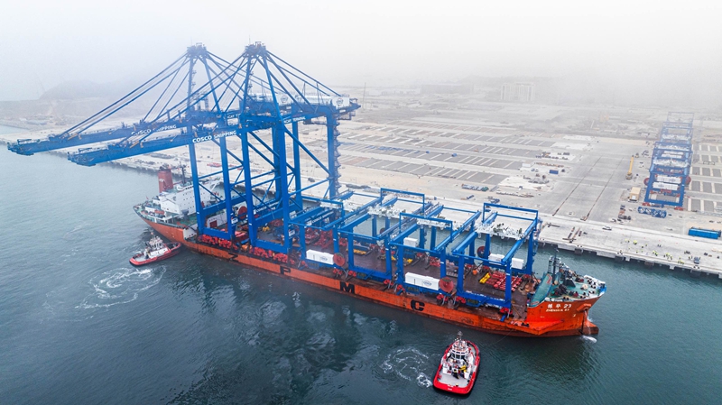 長長的防波堤宛若臂膀守護著嶄新的港口,高高的吊橋將自上海駛來的“秘魯輪”上裝有中國“新三樣”的集裝箱卸下,又將滿載秘魯特色產品的集裝箱裝上即將駛往中國的“新上海輪”。
