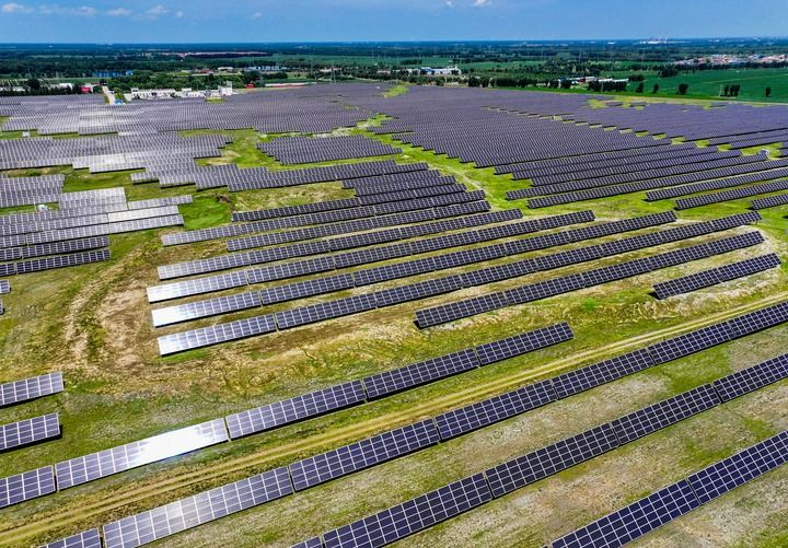 2024年7月19日拍攝的內(nèi)蒙古通遼發(fā)電總廠光伏電站(無人機照片)。新華社記者 連振 攝